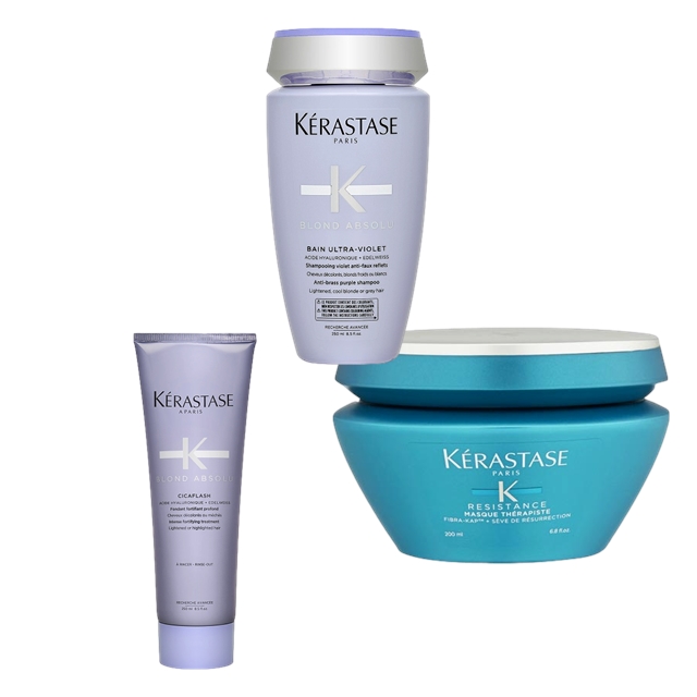KERASTASE Resistance Masque Therapiste Fiber Quality Renewal Masque (Very Damaged Over-Processed Thick Hair) & Blond Absolu Bain Ultra-Violet Anti-Brass Purple Shampoo (Lightened, Cool Blonde Or Gre